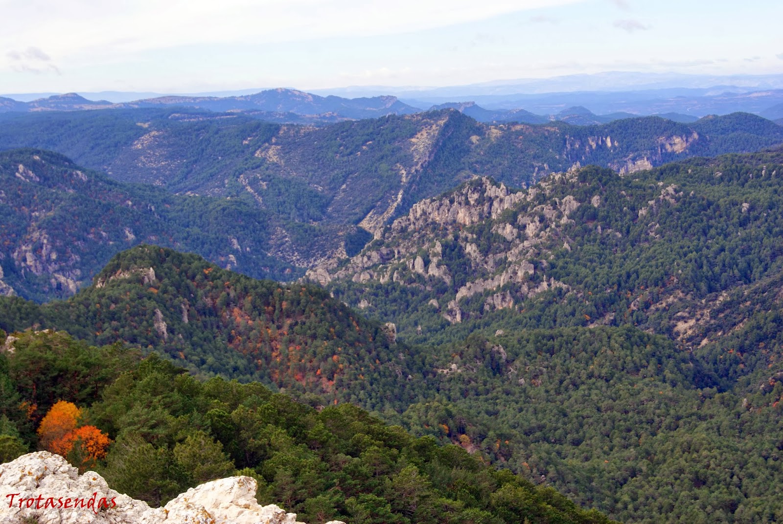 | Fantásticas vistas de en las que se aprecia el color ocre del hayedo de(les Fagedes Tancades) por donde volveremos al punto de partida. |